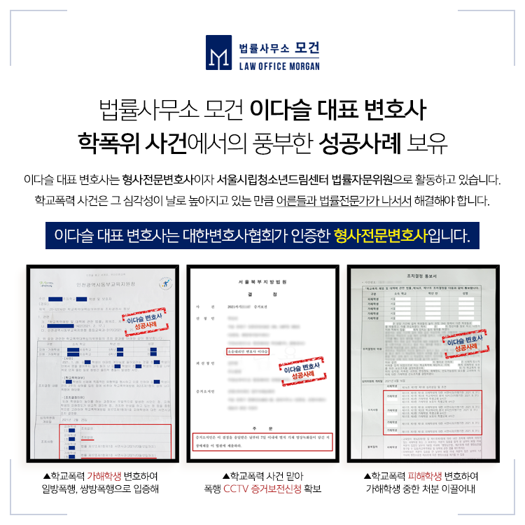 법률사무소 모건의 이다슬 대표 변호사는 형사전문변호사이자 서울시립청소년드림센터 법률자문위원으로 활동하며 청소년들의 건강한 성장과 교화를 돕고 있습니다. 학교폭력 사건에서 학교장자체해결, 학교폭력대책심의위원회는 물론 추후 이어질 수 있는 형사고소와 민사소송까지 철저한 조력을 제공하고 있으니 상담이 필요하신 분들은 법률사무소 모건으로 문의하시기 바랍니다.