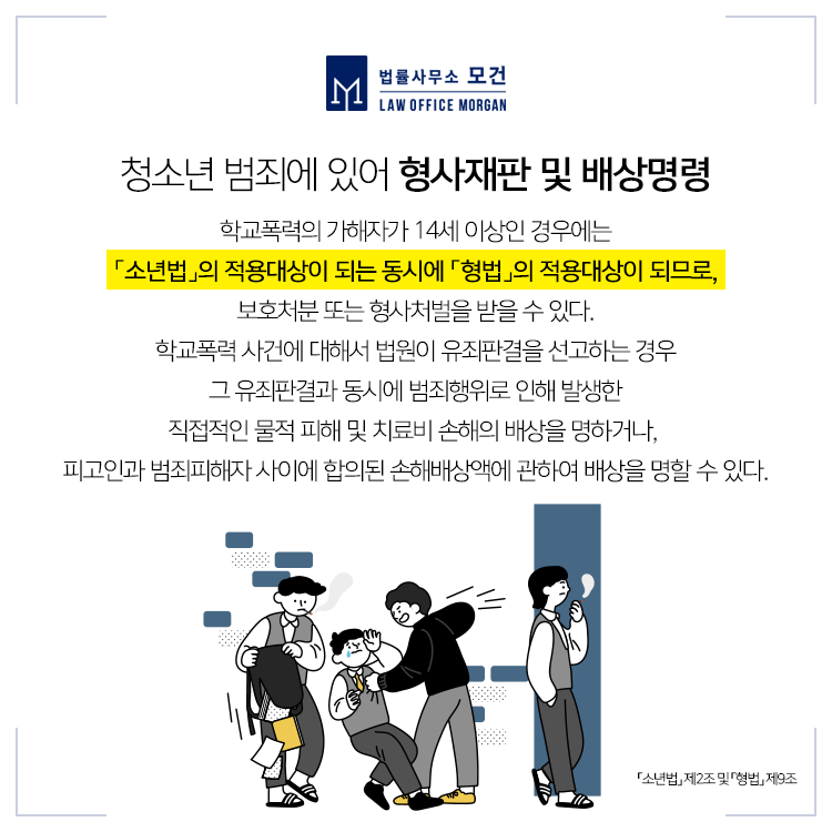 법률사무소 모건의 이다슬 대표 변호사는 형사전문변호사이자 서울시립청소년드림센터 법률자문위원으로 활동하며 소년법 사건에 탁월한 법률서비스를 제공하고 있습니다. 다수의 학교폭력대책심의위원회, 소년보호재판, 형사재판 사건을 맡아온 만큼 학생과 부모님에게 가장 최선의 결과를 이끌어내기 위해 노력하고 있습니다. 소년법변호사의 도움이 필요하신 분들이라면 법률사무소 모건으로 문의하시기 바랍니다.