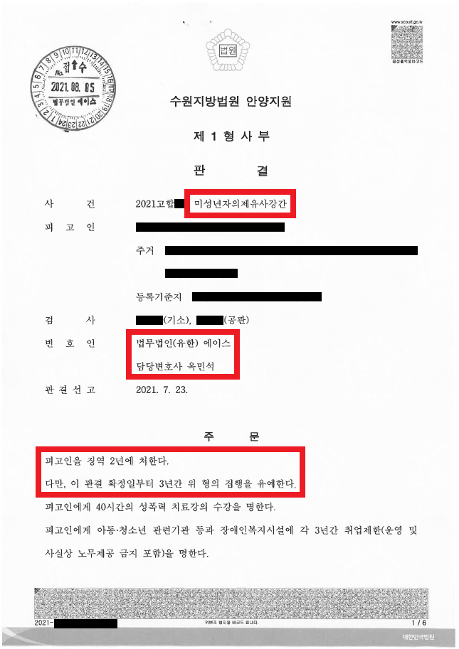 이러한 저의 조력을 바탕으로 A씨는 집행유예를 선고받음으로써 실형이 선고되어 구속될 위기에서 벗어날 수 있었습니다.