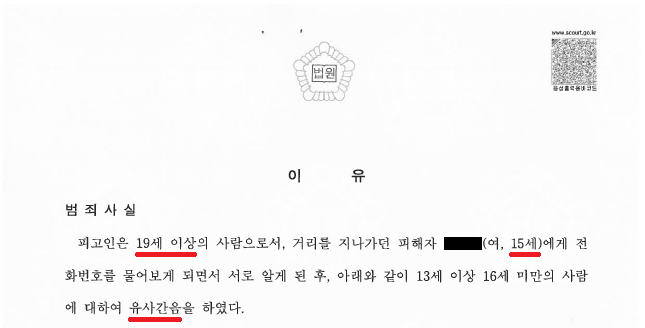 20대 후반의 회사원 A씨는 길을 걷던 중 마음에 드는 여성 B씨를 발견하였습니다. A씨는 B씨에게 다가가 전화번호를 물어보려고 하였는데, 가까이서 보니 매우 어려보였고, B씨 역시 자신은 15세 중학생이라고 하였습니다. A씨는 화들짝 놀라 B씨에게 사과하고 다시 가던 길을 가려고 하였는데, B씨가 뒤쫓아와 "괜찮다"라고 말하며 전화번호를 알려주었습니다.