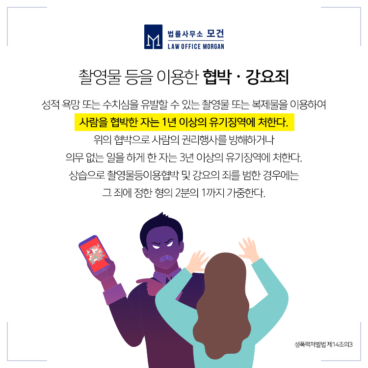 2020년 5월, 디지털 성범죄에 대한 엄벌을 요구하는 사회적 분위기에 따라 성범죄 관련 법들이 대대적으로 개정·신설되었습니다. 신설된 법조항에는 「성폭력처벌법」 제14조의3의 촬영물등을이용한 협박·강요죄가 있는데, 이는 성적 욕망 또는 수치심을 유발할 수 있는 촬영물 또는 복제물을 이용하여 사람을 협박한 자는 1년 이상의 유기징역에 처한다는 내용입니다. 또한 위의 협박으로 사람의 권리행사를 방해하거나 의무 없는 일을 하게 한 자는 3년 이상의 유기징역에 처할 수 있는데요.