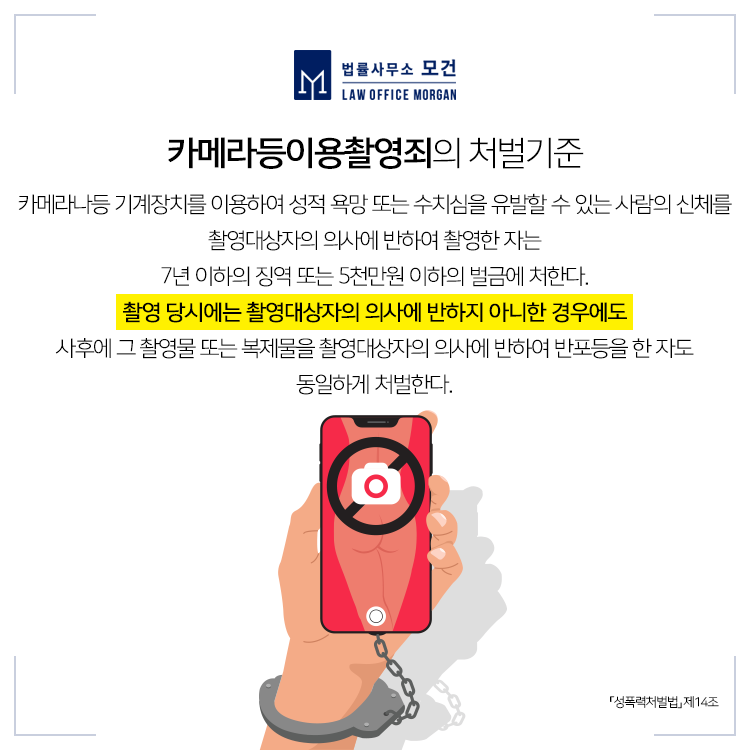 법률사무소 모건의 이다슬 대표 변호사는 실제 카메라등이용촬영죄 및 협박죄의 사건을 맡아 집행유예 처분을 이끌어낸 성공사례를 보유하고 있으며, 관련 혐의를 받고 계신 분들을 위한 법률대리를 적극적으로 도와드리고 있습니다. 각종 조사 대응 및 조사 동행부터 재판까지 대표 변호사가 철저한 조력을 제공하고 있으니 종로, 혜화, 마포 등 관련 상담이 필요하신 분들이라면 법률사무소 모건으로 문의하시기 바랍니다.