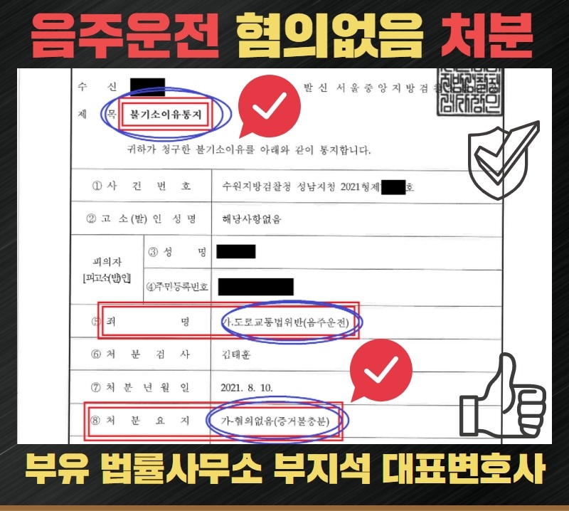 부유법률사무소의 적극적인 방어에 힘입어 결국 검찰 단계에서 음주운전 혐의에 대하여 혐의없음 무혐의 처분을 이끌어 낼 수 있었습니다.