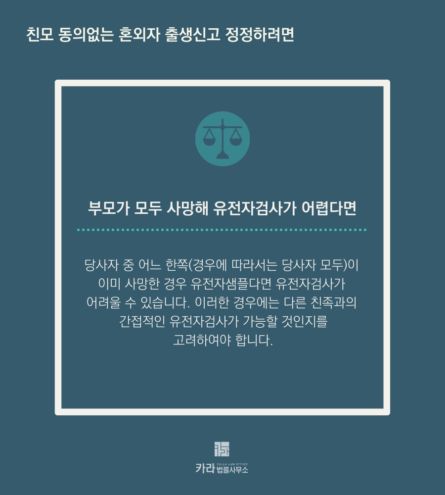 그런데 당사자 중 어느 한쪽(경우에 따라서는 당사자 모두)이 이미 사망한 경우 유전자샘플다면 유전자검사가 어려울 수 있습니다. 이러한 경우에는 다른 친족과의 간접적인 유전자검사가 가능할 것인지를 고려하여야 합니다.
