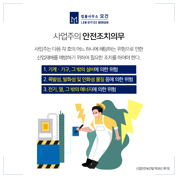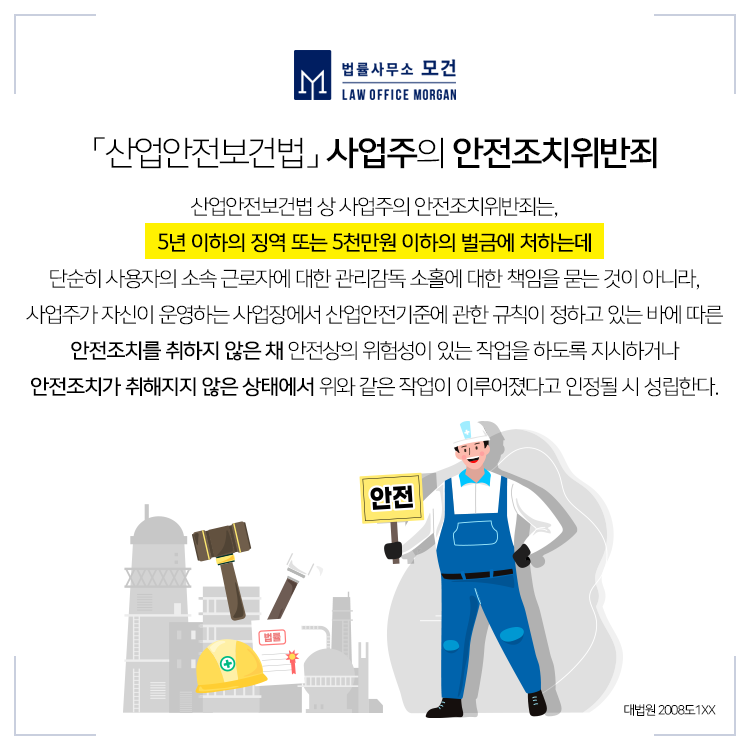 「산업안전보건법」 에서는 사업주의 안전조치의무를 두고 있으며, 이를 위반할 시 5년 이하의 징역 또는 5천만원 이하의 벌금에 처한다고 규정하고 있습니다. 만약 이를 위반하여 근로자가 사망에 이르게 될 경우 7년 이하의 징역 또는 1억원 이하의 벌금으로 더욱 무겁게 처벌되고 있는데요.