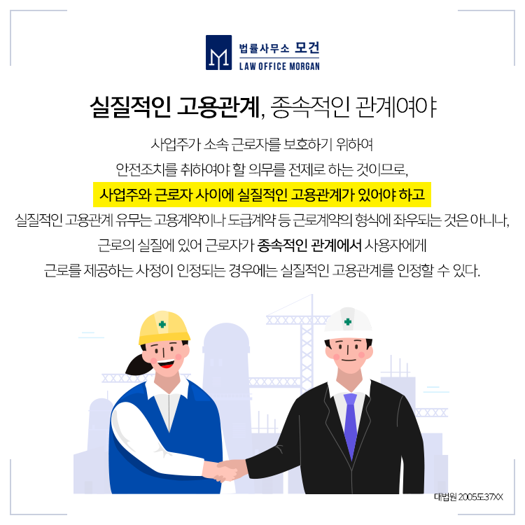 여기서 말하는 '사업주'란 근로자를 사용하여 사업을 하는 자를 의미합니다. 하지만 산업현장은 위탁계약이 활발하고, 몇차례에 걸친 하도급으로 이루어지는 경우가 많아 실질적으로 안전조치의무를 가지는 '사업주'가 누구인지를 명백하게 가려내는 것이 중요한데요. 이는 형사처벌의 유무로도 이어지는 문제이기 때문에 형사전문변호사의 세심한 법률조력을 받아 대응하셔야 합니다.