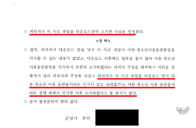 ③ 군검찰 조사를 받은 후 "A씨가 '5 권○○.zip' 아청물을 다운로드받은 사실은 있으나, 주식 관련 텔레그램 대화방에서 주식 관련 파일으로 알고 다운로드받은 것으로 아청물을 소지하겠다는 고의는 전혀 없었으므로, 아청물소지죄는 성립하지 않는다"라는 내용의 변호인의견서를 작성하여 제출하였습니다.