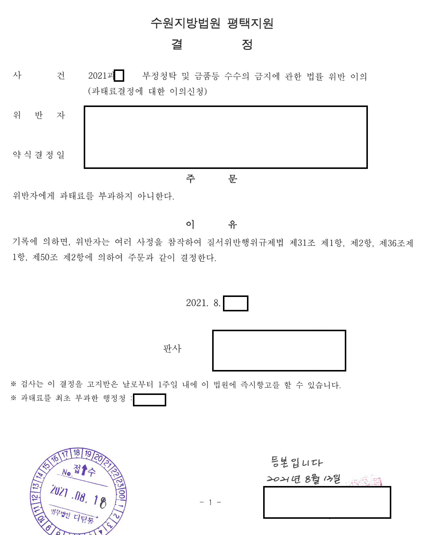 오늘은 이른바 김영란 법이라고 불리는 부정청탁 및 금품 등 수수의 금지에 관한 법률위반에 대해 포스팅을 합니다. 최초 약식 결정으로 과태료가 부과되었으나 의뢰인이 이의신청을 한 이후에 저를 선임하였습니다. 기간이 짧아 재판 준비가 다소 빠듯했지만 그래도 의견서를 적시에 제출했고, 심문기일에 함께 출석하여 과태료 부과의 부당함을 피력하였습니다. 그리고 그 결과는 과태료 부과를 기각하는 결정이 나왔습니다.
