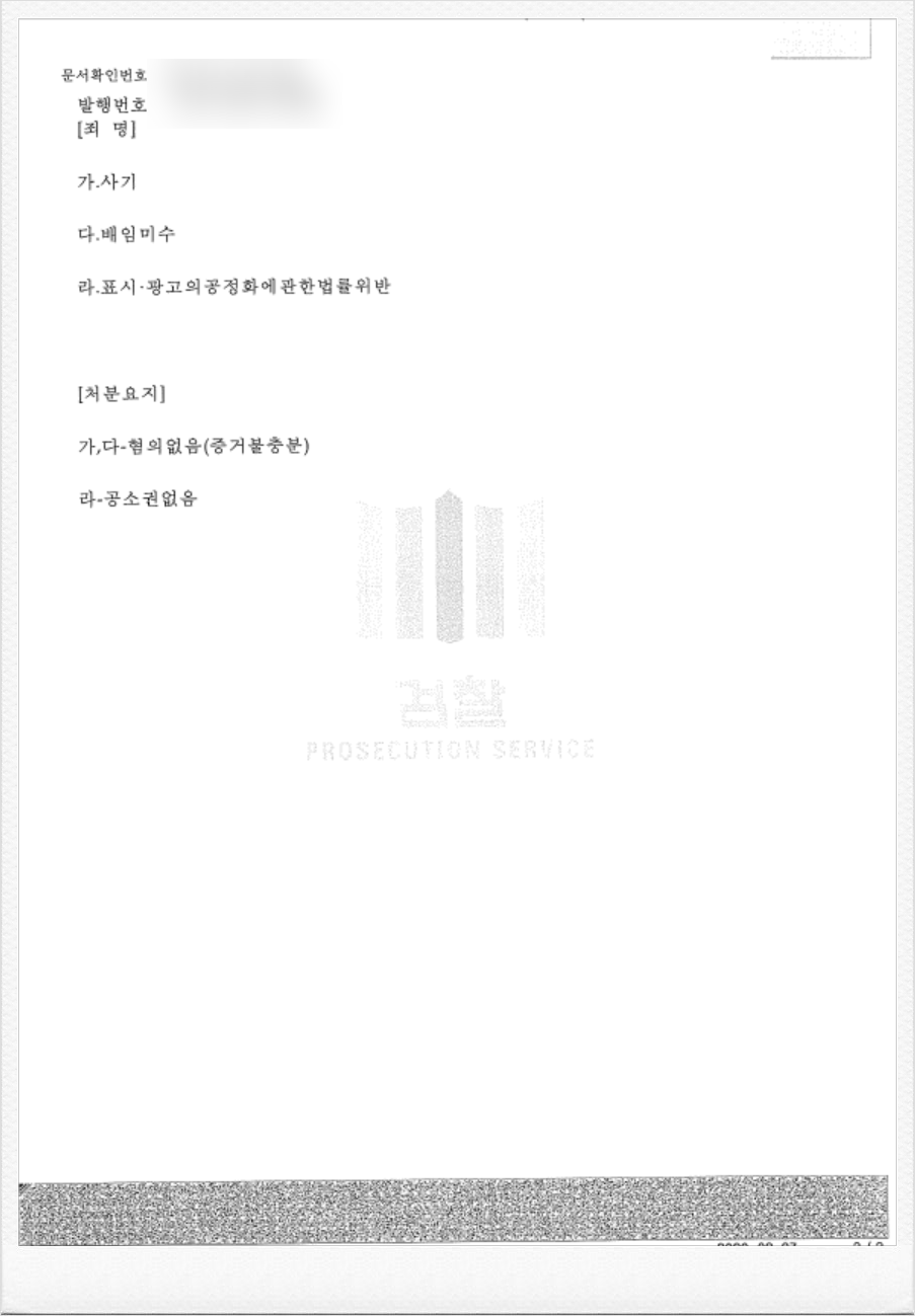 위 사안은 경찰에서 분양사기 혐의에 대하여 기소 의견으로 검찰에 송치된 후 본 변호인이 선임된 사안이었습니다. 본 변호인은 해당 광고를 하게 된 경위 및 해당 광고가 허위에 해당하지 않는다는 점에 대해서 적극적으로 변론하였고, 이에 의뢰인 회사의 분양사기 혐의에 대해서 전격적으로 재검토가 이루어지게 되었습니다. 재조사 결과 분양사기 및 관련 혐의 전부에 대해서 혐의없음 불기소 처분을 받았습니다.