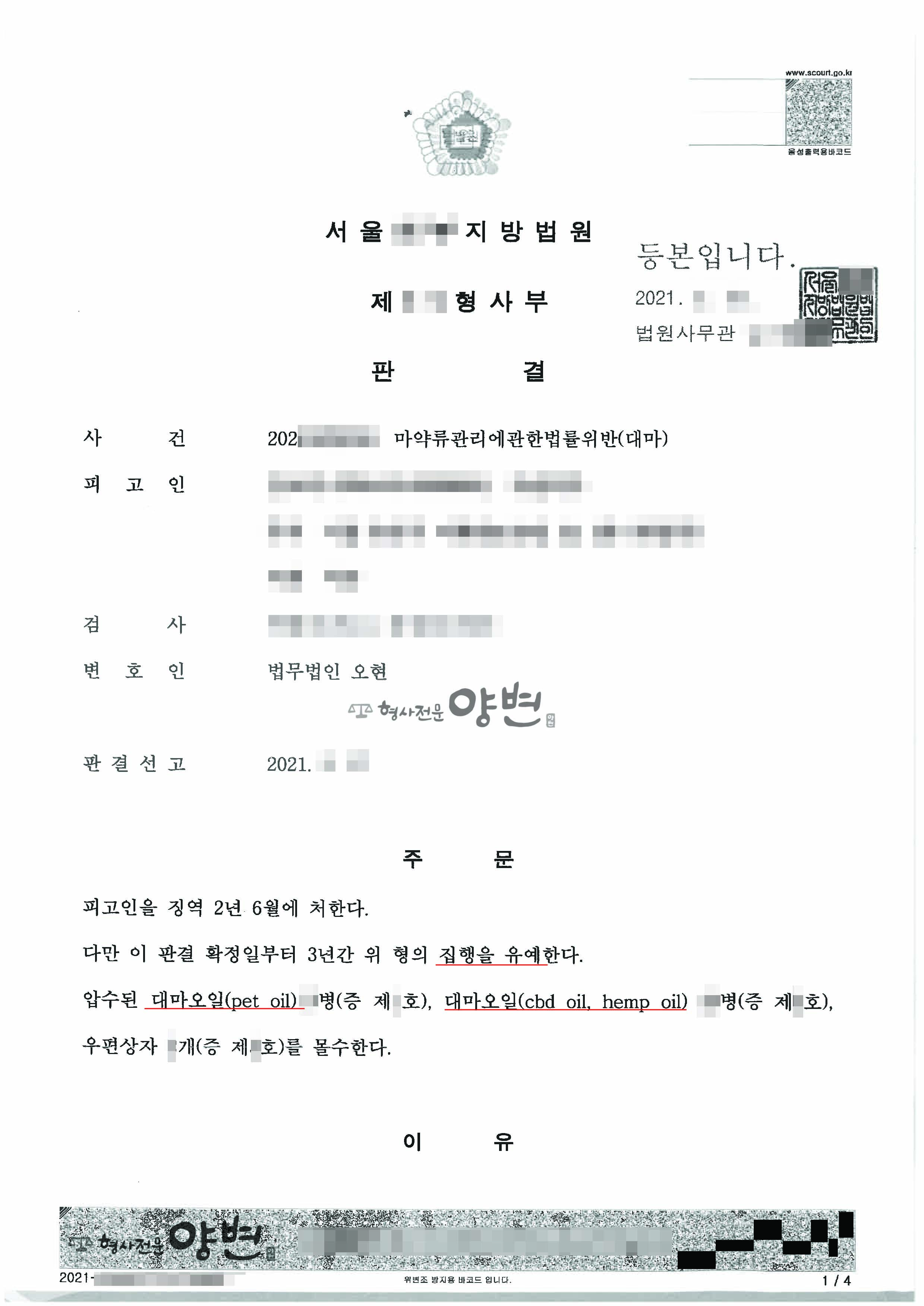 대마오일은 대마식물의 한 종인 햄프의 잎, 줄기, 꽃 등으로부터 고순도의 CBD 성분을 추출한 오일을 말하는데, CBD 성분은 통증 및 스트레스 완화, 항암 등에 효과가 있다고 알려져 있습니다. 그러나 국내 마약류관리법은 CBD 성분을 대마로 규율하고 특히 밀수입에 대하여 법정형을 ‘무기 또는 5년이상의 징역’으로 규정하고 있는 바, 의뢰인으로서는 실형을 피하기 어려운 상황이었습니다.