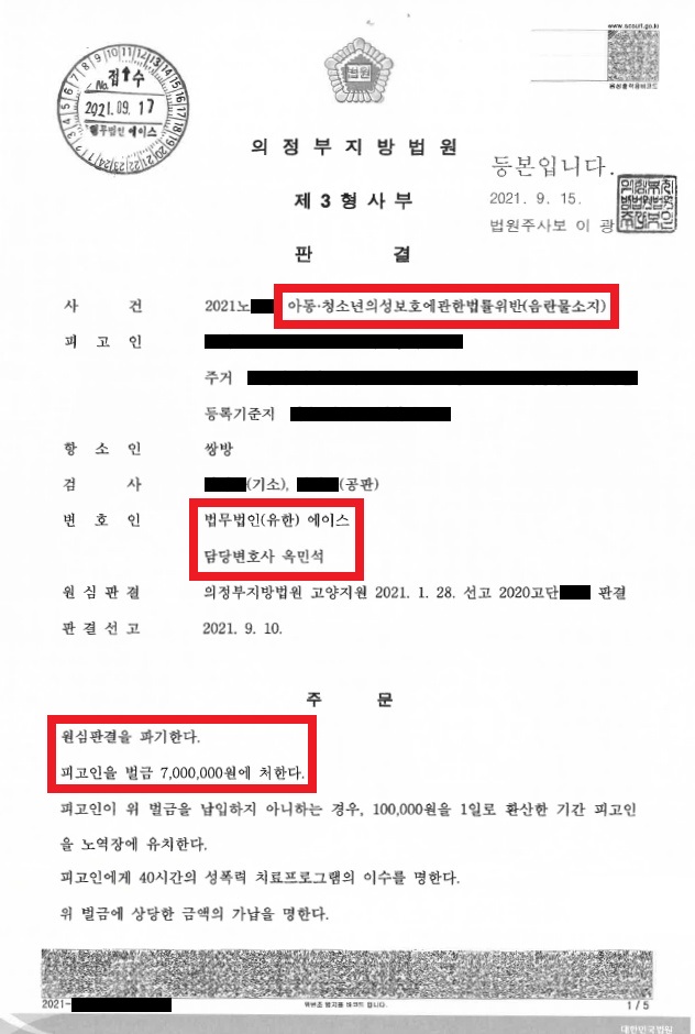 이러한 저의 조력을 바탕으로 A씨는 '원심판결 파기, 벌금형'을 선고받음으로써 실형을 피할 수 있었을 뿐만 아니라 신상정보 등록 대상에도 해당하지 않게 됨으로써 불이익을 최대한 줄일 수 있었습니다.