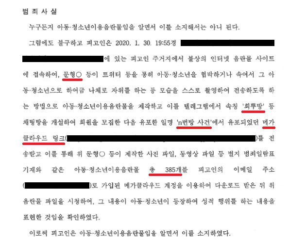 A씨는 2020. 1. 30. 19:55경 인터넷 음란물 사이트를 둘러보던 중, 문형○(일명 '갓갓')이 트위터 등을 통하여 권○○, 방○○ 등 아동·청소년을 협박하거나 속여서 그 아동·청소년으로 하여금 나체로 자위를 하는 등 모습을 스스로 촬영하여 전송하도록 하는 방법으로 아동·이용음란물을 제작하고 이를 텔레그램에서 속칭 '회뿌방' 등 채팅방을 개설하여 회원을 모집한 다음 유포한 일명 'N번방 사건'에서 유포되었던 메가클라우드 링크에 접속한 뒤, 문형○이 제작하여 유포한 'N번방' 아동·청소년이용음란물 385개가 압축되어 있는 '5 권○○.zip' 파일을 자신의 메가클라우드 계정으로 들여오기하였습니다.