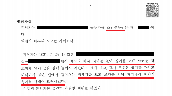 소방공무원 A씨는 2021. 7. 25. 16:42경 동네 골목에서 바지 지퍼를 열어 성기를 꺼내 모자로 가리고 걸어다니다가 맞은 편에서 걸어오는 여성 B씨를 보고 모자를 치워 성기를 드러냈습니다. B씨는 화들짝 놀라 A씨를 경찰에 신고하였고, 얼마 뒤 A씨는 공연음란 혐의로 조사를 받게 되었습니다.