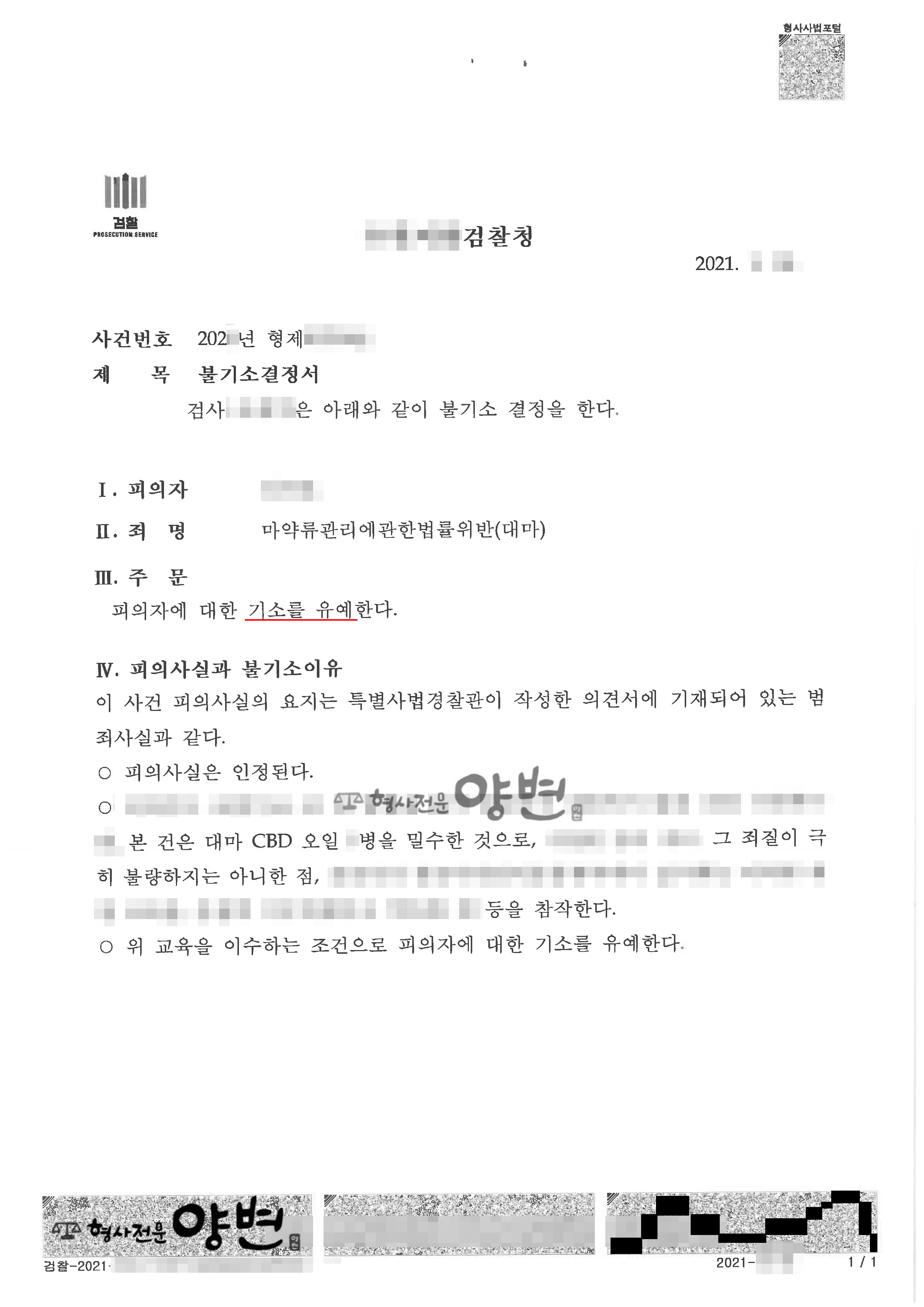 담당검사는 “죄질이 극히 불량하지 아니한 점 등을 참작한다”며 의뢰인에 대해 교육조건이수조건부 기소유예 처분을 하였습니다.