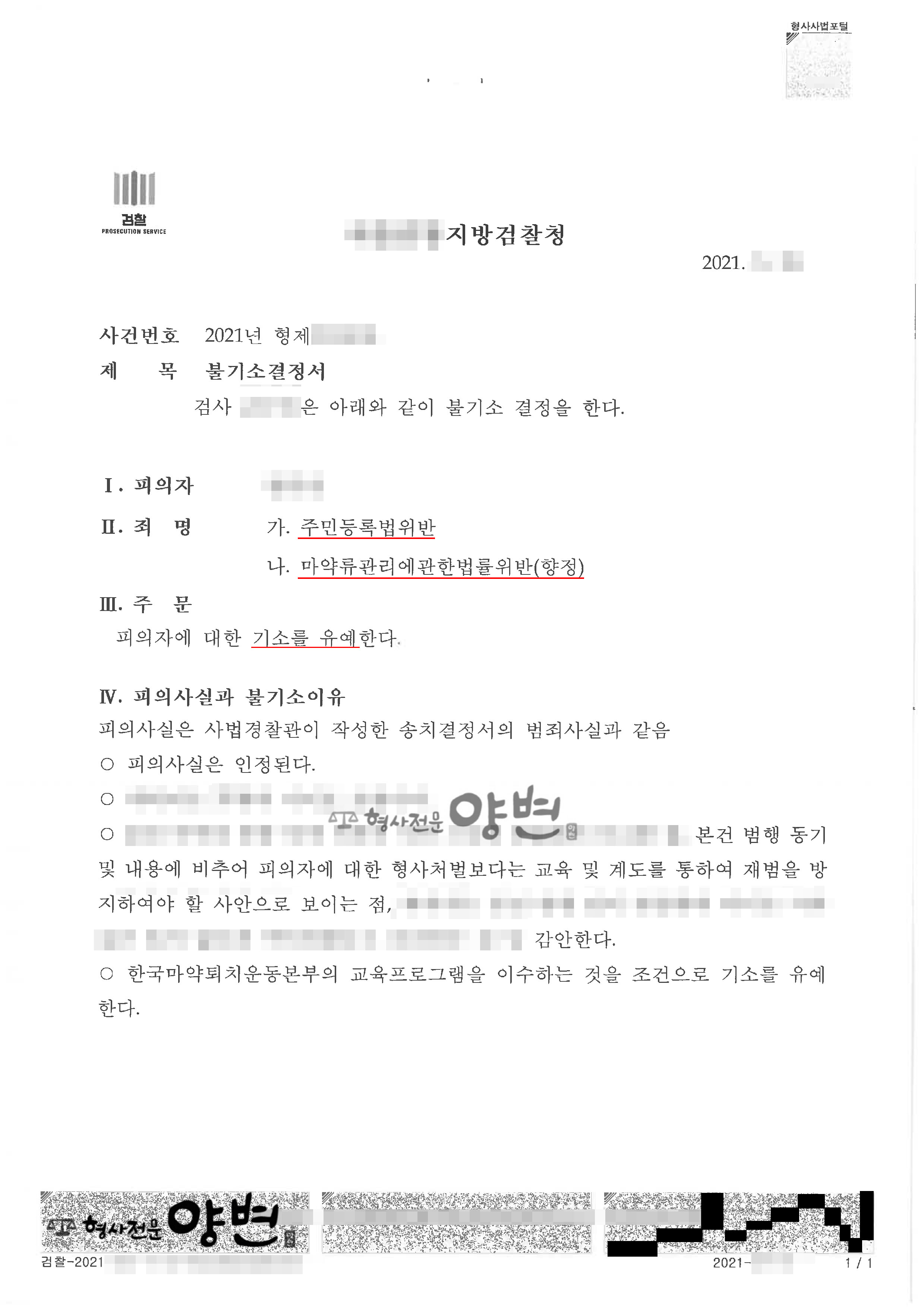 담당검사는 “본검 범행 동기 및 내용에 비추어 형사처벌보다는 교육 및 계도를 통하여 재범을 방지하여야 할 사안으로 보이는 점 등을 감안한다”며 의뢰인의 ① 주민등록법위반, ② 마약류관리법위반에 대해 모두 교육이수조건부 기소유예 처분을 하였습니다.