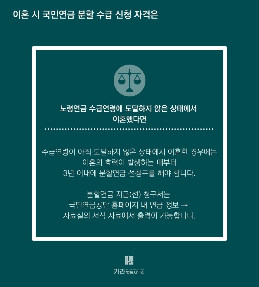 수급연령이 아직 도달하지 않은 상태에서 이혼을 한 경우에는 이혼의 효력이 발생하는 때부터 3년 이내에 분할연금 선청구를 해야 합니다.