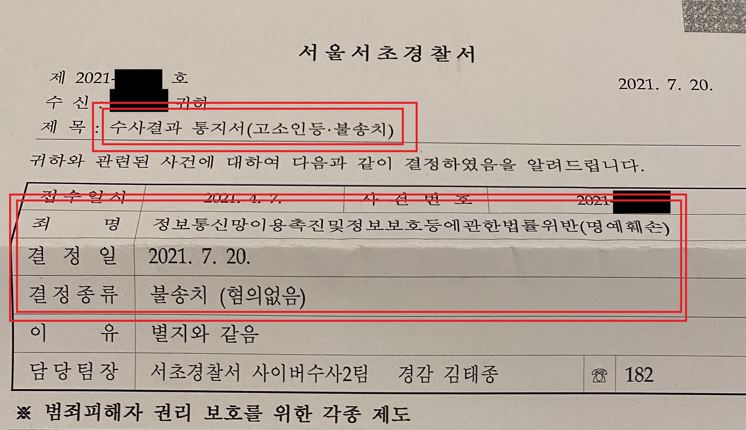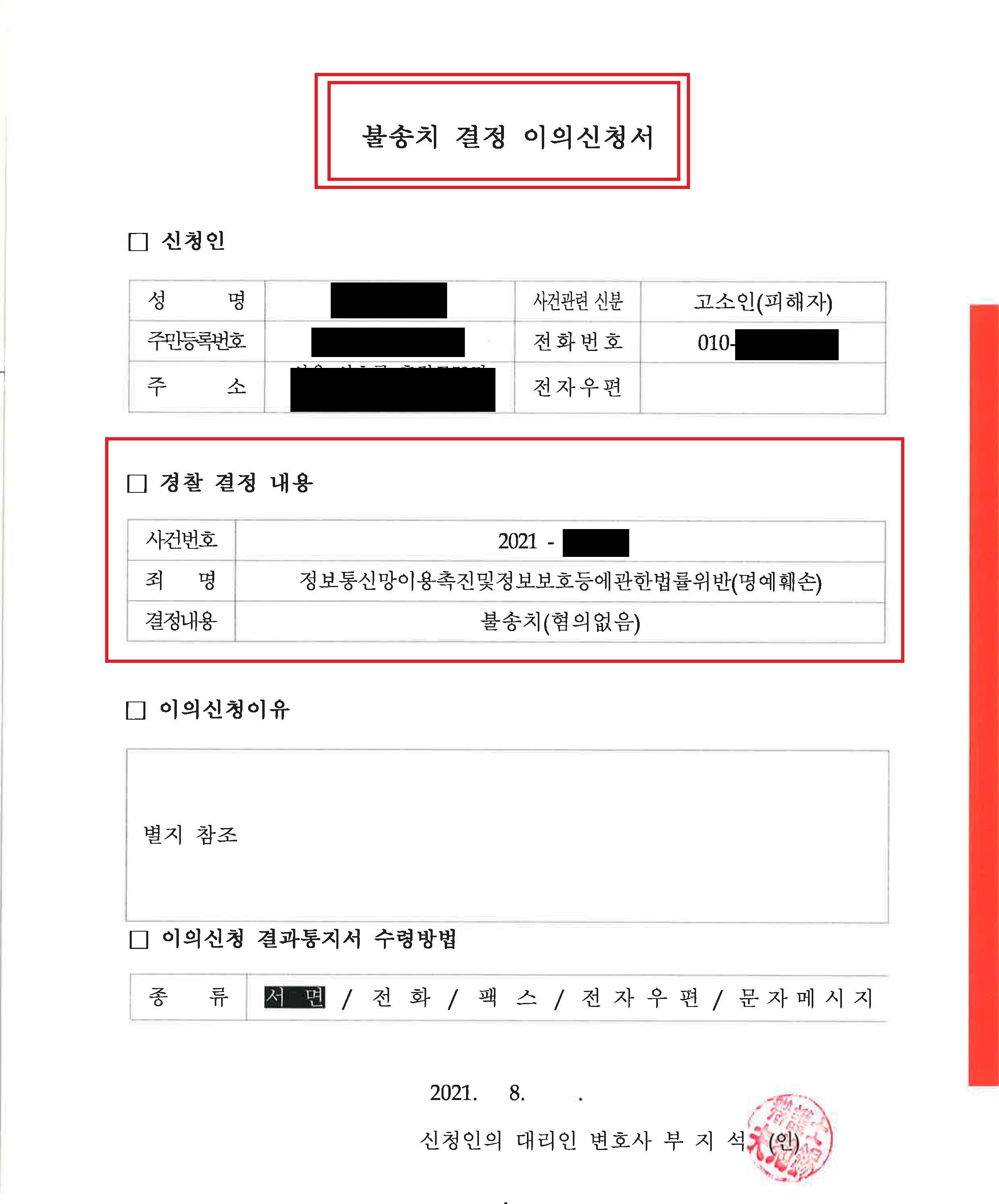 모욕죄, 명예훼손 기타 형사고소 사건을 혼자서 진행하시다가 불송치결정 처분을 받으신 분들은 법률전문가의 도움을 받아 불송치결정에 대한 이의신청을 진행해 보시길 권해드립니다.