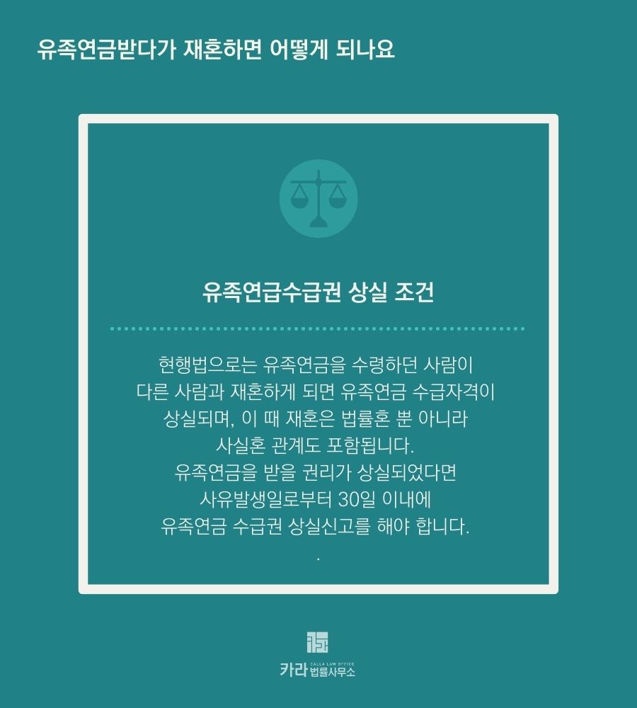 그러나 현행법상으로는 여전히 재혼을 하게 될 경우 유족연금 자격이 박탈되고 상실신고를 하지 않은채 계속 수령하다가 관계기관에 적발된다면 수급 자격 박탈은 물론 지금까지 수령한 유족연금 전부를 돌려줘야하므로 유의해야겠습니다.