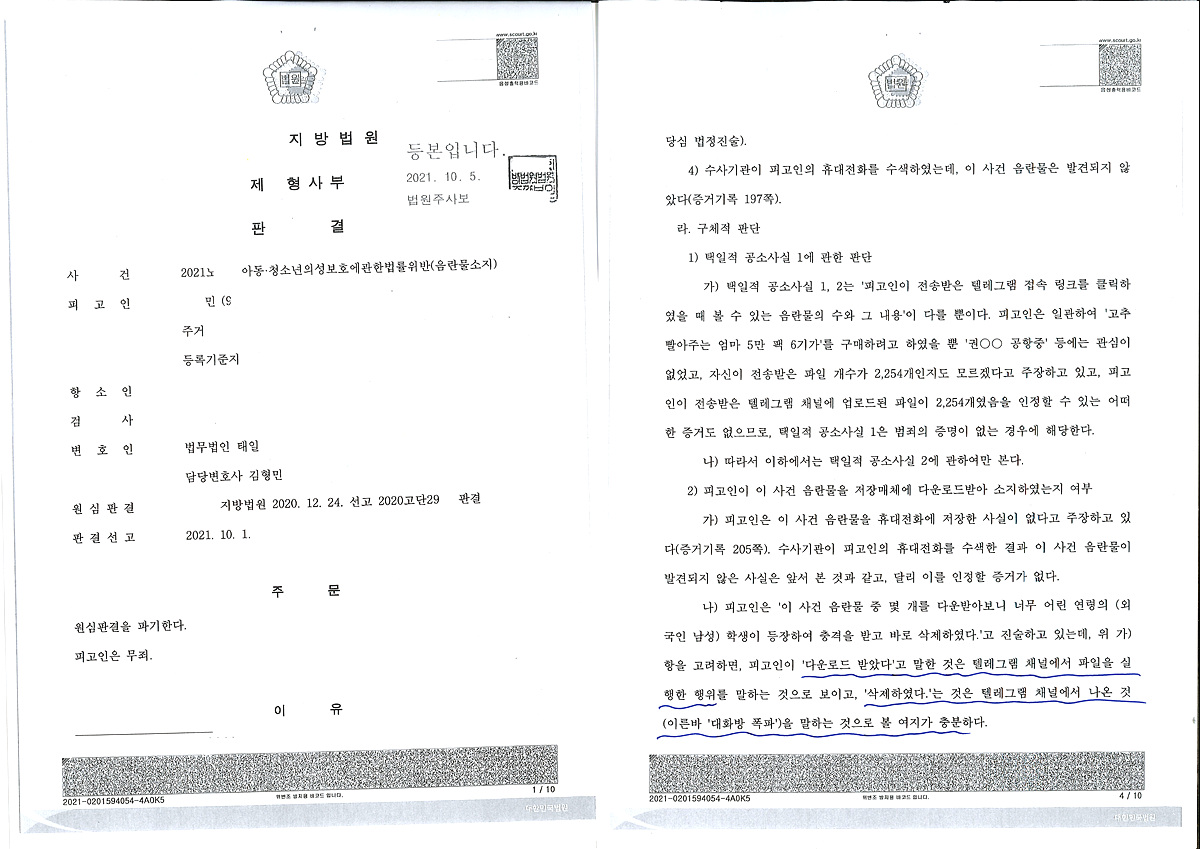 간단히 소개하자면 1.에 대해서는 판례의 취지가 텔레그램 단순 참여자도 소지로 본다는 것이 아니며 그러한 주장대로라면 큰 불합리가 있을 수 있다는 것이었고 2.에 대해서는 자동저장기능은 용량제한이 있다는 것 및 이에 대한 고의가 문제될 수 있다는 것이었습니다. 텔레그램 자동저장기능의 용량제한은 사진, 동영상 10메가, 파일 1메가이며(모바일일 경우), 쉽게 생각하면 자동저장기능은 일일이 저장을 따로 하지 않아도 편하게 다운로드 받을 수 있도록 기능을 만들어 둔 것인데 용량의 제한이 없이 몇 GB의 대용량이라도 의도하지 않게 모조리 자동으로 저장되게 되면 핸드폰 등 저장매체의 용량이 버틸 수 없기 때문에 당연한 것입니다.