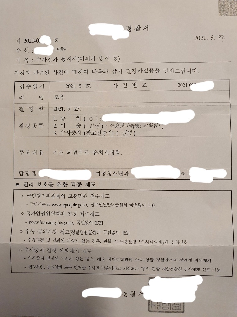 고소인으로부터 성적 수치심을 느끼는 피해를 당한 사실이 없는 경우 고소인과의 관계에서 성적 자존심이 손상되어 이를 회복하고자 하는 목적도 있을 수 없을 것입니다. 고소인에게 성적 수치심을 느끼게 하여 성적 자존심을 느끼려는 성적인 욕망은 판례의 사안과 같지 않은 게임을 하다가 이루어진 성패드립 사건에에서 고소인과 피고소인 관계에서는 전혀 부합하지 않는 것입니다. 이러한 경우라면 고소인으로부터 어떠한 성적인 수치심이나 성적 자존심이 손상된 일이 없었기 때문에 이를 회복할 의도는 당연히 없었다고 보아야 마땅할 것입니다. 결과적으로 통매음으로 고소된 사안이었음에도 불구하고 게임 내 성패드립 사안에 통매음에 대하여는 불송치, 모욕죄로 송치결정이 내려졌습니다.