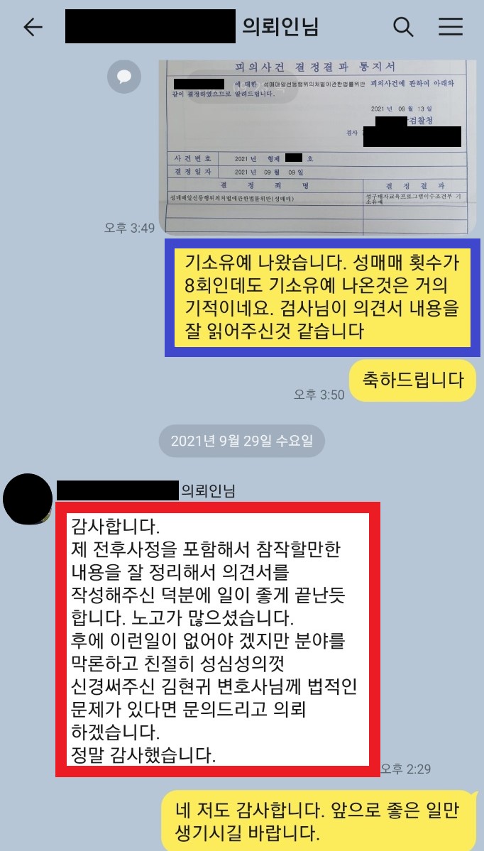 혐의를 인정하는 사건이 하더라도, 설령 실무상 기소유예 가능성이 높은 사건이 하더라도, 진행 과정에서는 저도 의뢰인도 최선을 다하는 것이 중요합니다. 성매매 횟수가 아무리 많더라도 진심을 다해 적극적으로 진행한다면 기소유예 처분이 가능하다는 것을 보여주는 성공 사례라 할 것입니다.