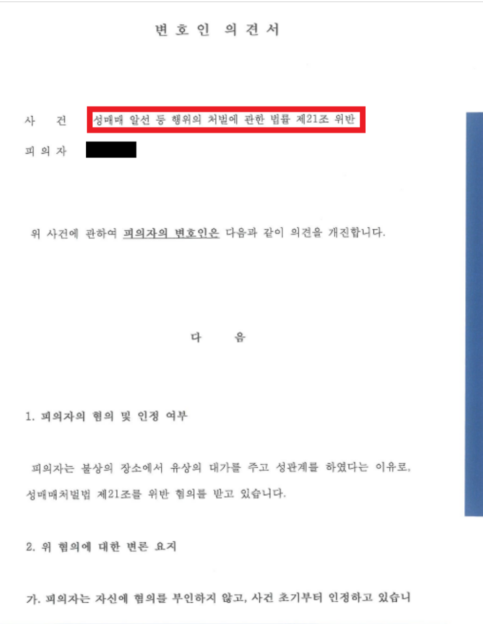 그러던 중 경찰로부터 성매매 혐의로 적발되었으니 출석하라는 요구를 받게 되었습니다. 여러 업소를 다닌 터라, 도대체 어디가 걸린 것인지, 또 그 곳에 내가 몇 번을 갔는지도 모르는 상황에서, 대응 방안을 찾기위해 저를 찾아오게 되었습니다.