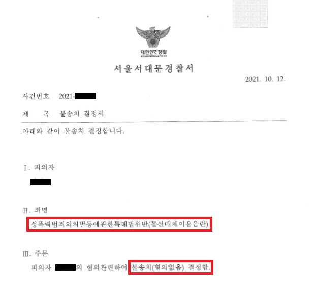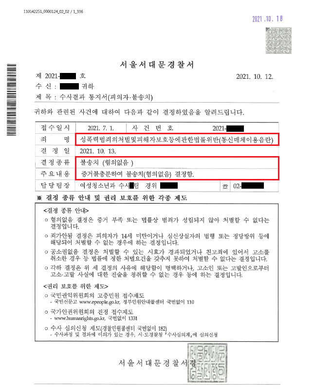 이러한 저의 조력을 바탕으로 A씨는 '불송치(혐의없음)' 결정을 받음으로써 억울하게 성범죄자가 될 위기에서 벗어날 수 있었습니다.