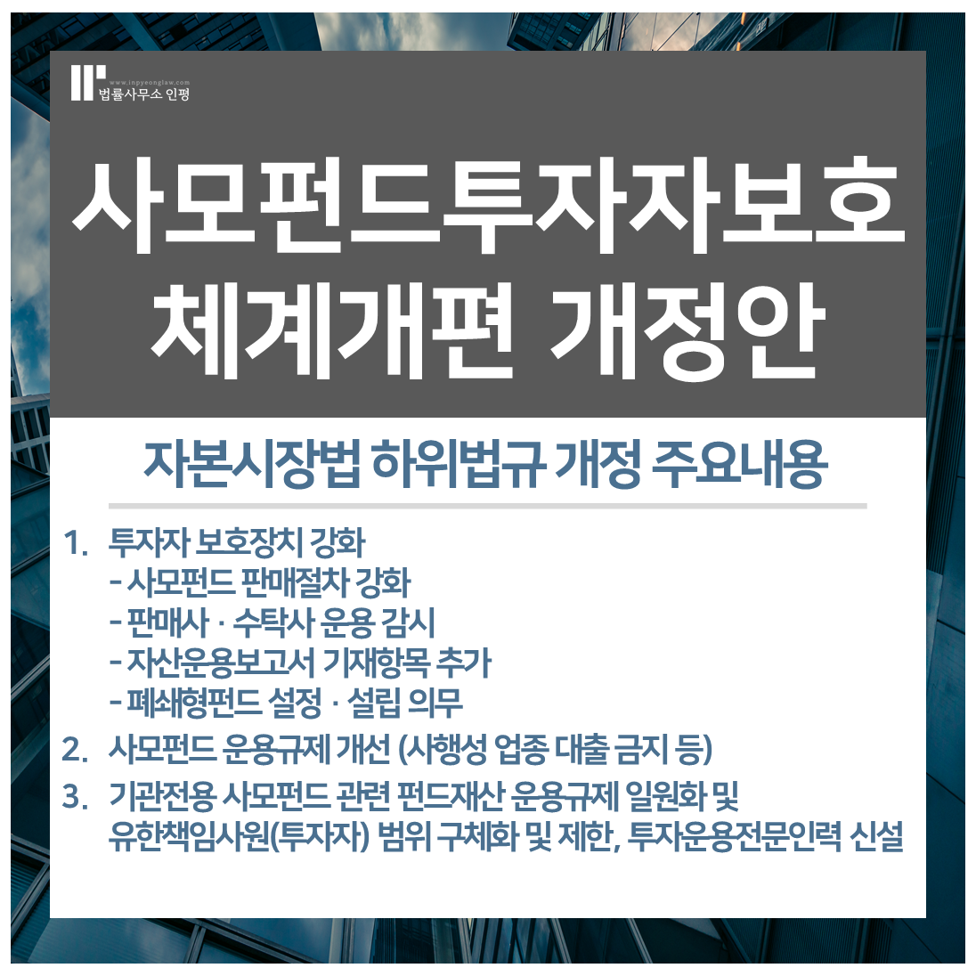 최근 잇달아 많은 수의 피해자가 발생한 라임 · 옵티머스 등의 사모펀드 사태에 따른 사모펀드 사태 재발방지 및 투자자의 보호 강화를 위한 후속 조치로 2021년 10월 19일 국무회의에서 자본시장법의 시행령 개정안이 의결되었고, 본 개정안과 관련된 '자본시장법 및 하위법류 개정안'은 오는 2021년 10월 21일부터 시행됩니다.