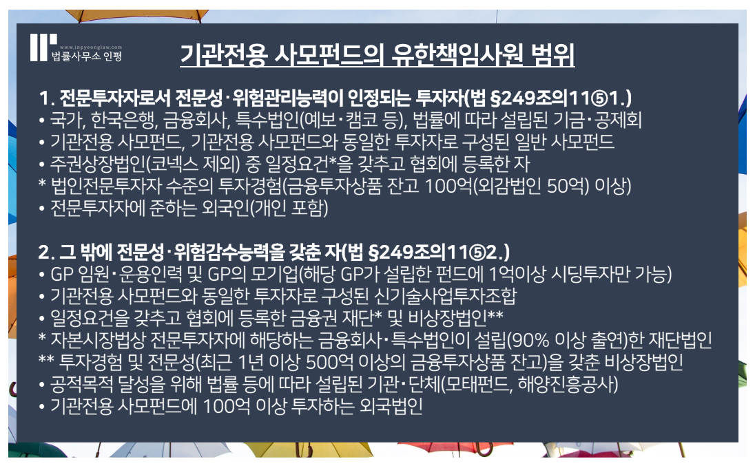 기관전용 사모펀드의 유한책임사원(투자자)의 범위가 전문성과 위험관리능력을 갖춘 기관투자자 등으로 제한되었으며, 투자자의 범위를 구체화하였습니다. (개인(외국인, GP 임직원 제외)이 아닌 자로서 전문성 등을 갖춘 자(법 §249의11⑤))