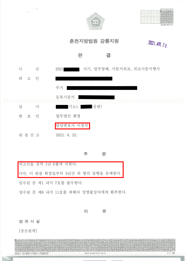 다행이 모든 피해자들의 인적사항을 확보하고 합의에 이르게 되어 의뢰인은 실형의 선고를 면하고, 집행유예 판결을 받을 수 있었습니다.