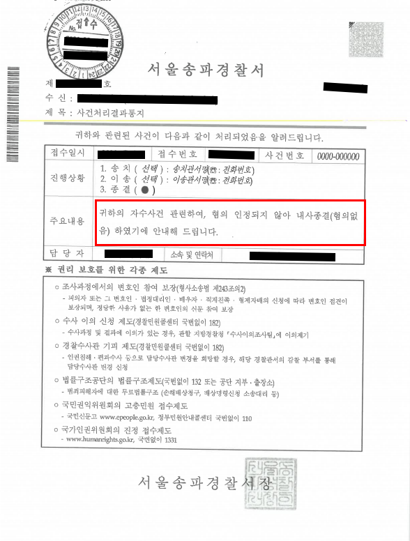 본 사안의 경우 의뢰인은 보이스피싱의 피해자이고, 보이스피싱에 가담한다는 범의가 전혀 없다고 보여진다는 점을 적극적으로 주장하여 혐의없음 내사종결 처분을 받게되었습니다.