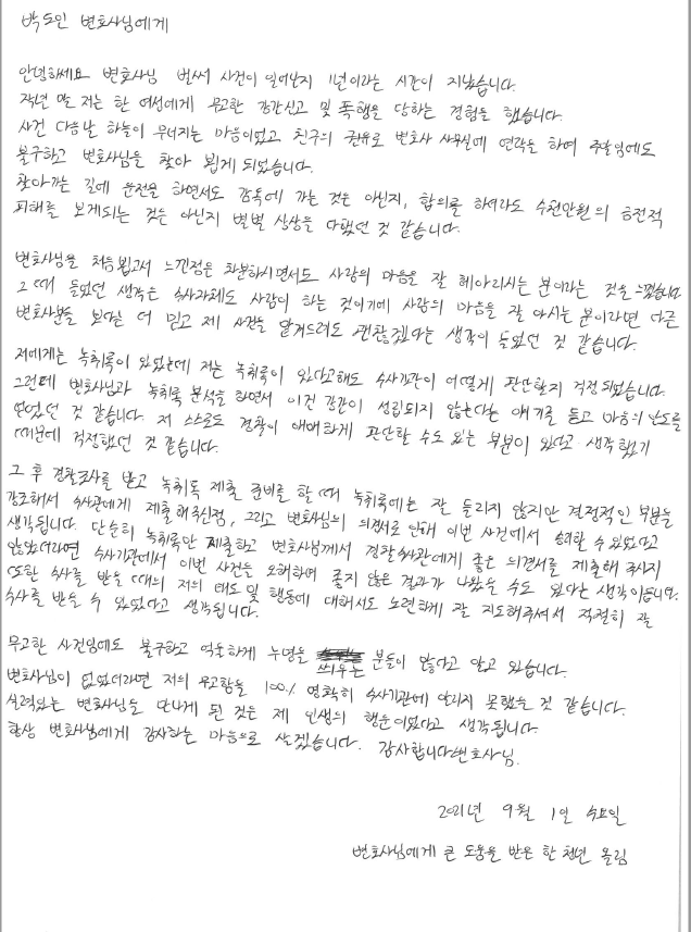 저도 그러한 의뢰인의 결정에 동의하나 만약 고소인이 자신의 잘못을 인정하지 않는 모습을 지속적으로 내비쳤다면 저와 의뢰인 모두 고소인을 무고죄로 고소하였을 것이라 생각하고, 그 때는 아마 고소인이 무고죄로 처벌받았으리라 확신합니다.