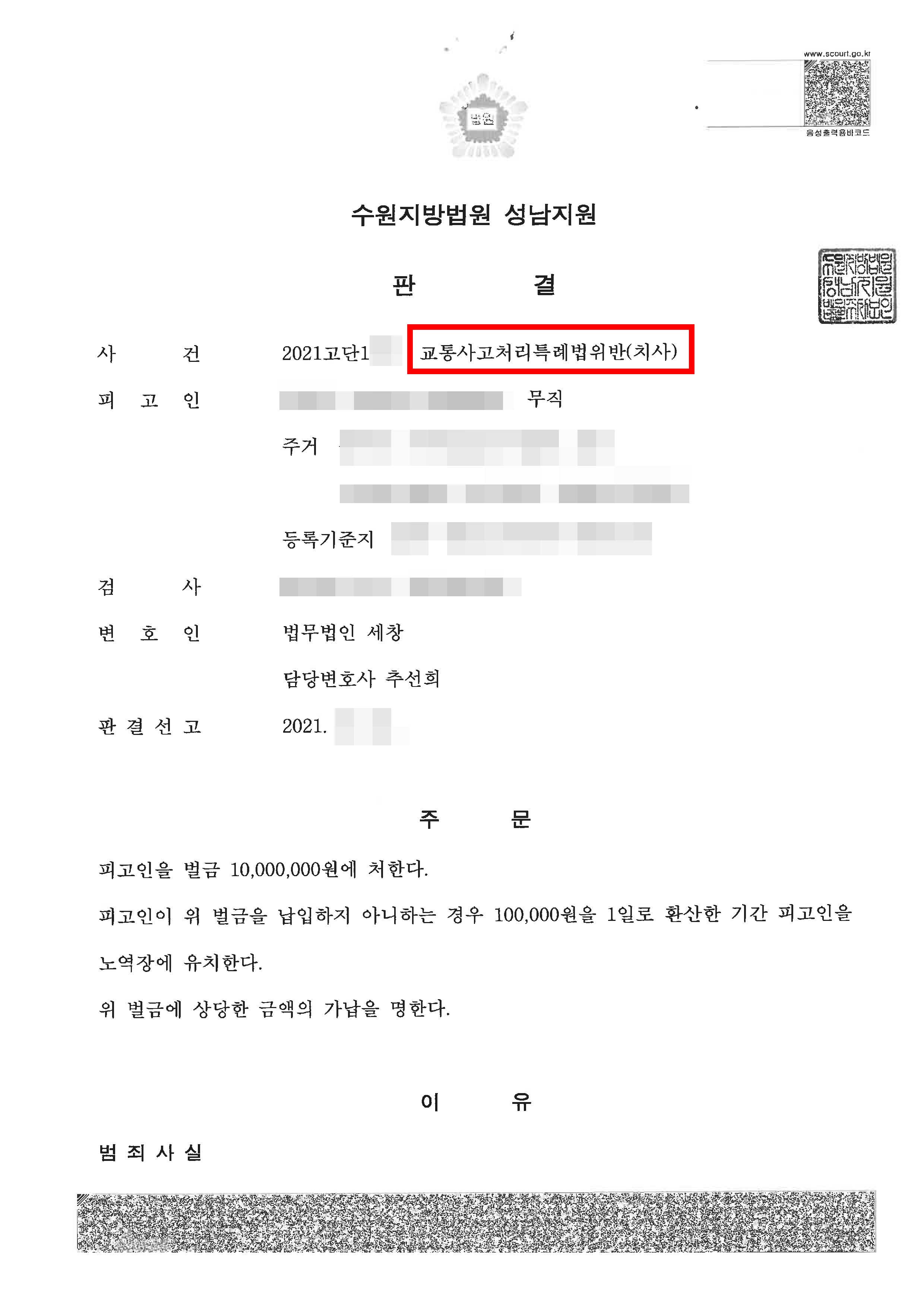 그결과 법원은 의뢰인의 부주위로 비록 피해자가 사망하였지만, 의뢰인이 범행을 인정하고 반성하고 있고, 피해자 유족과 합의에 이른점, 다른 범죄전력이 없는 점 등을 들어 재판부는 벌금형을 선고하였습니다.