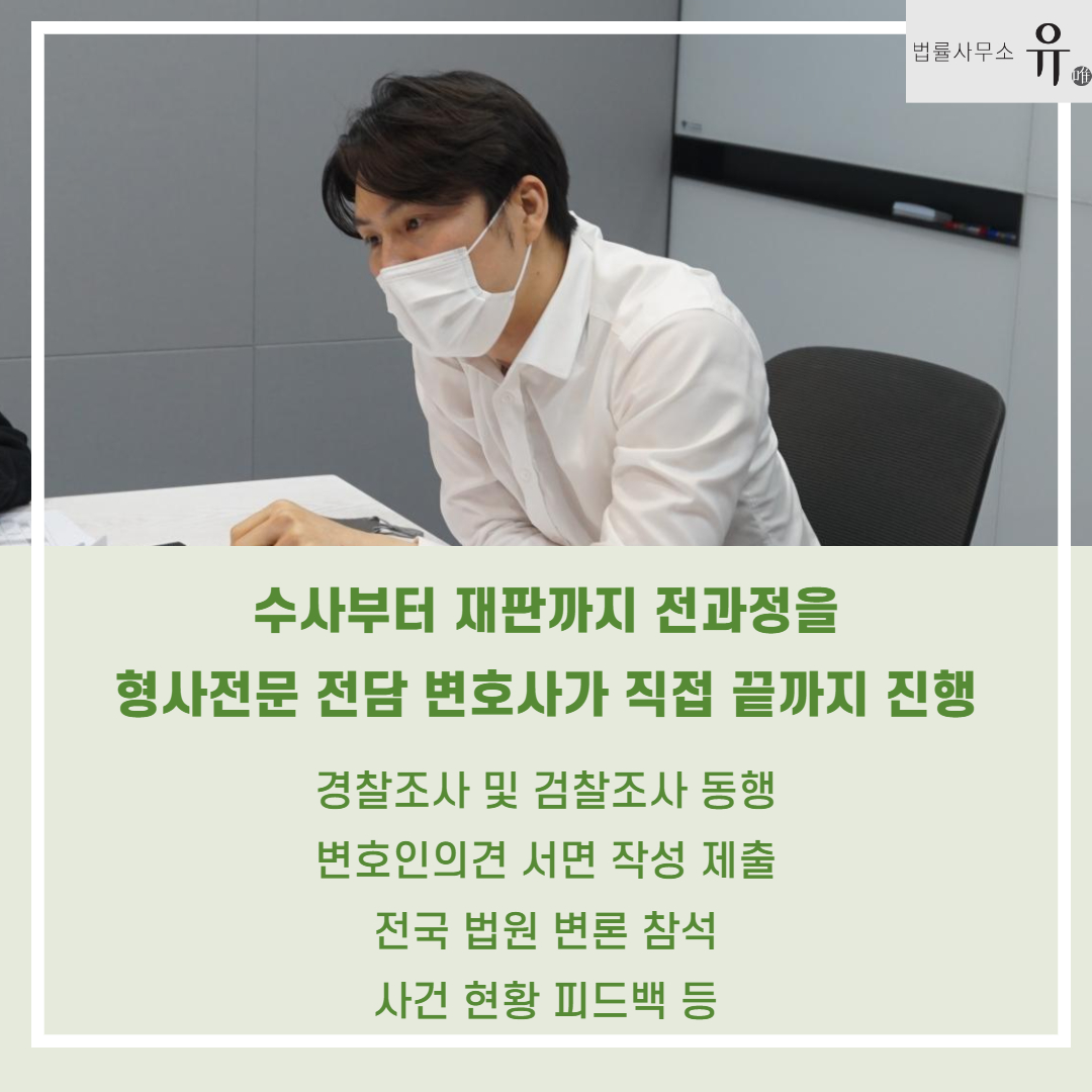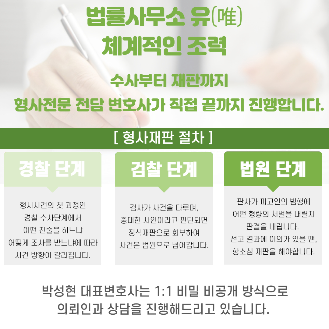 그래서 피의자 혐의를 받고 있다면 수사 초기에 변호사를 선임하여 현재 상황에서 적용될 수 있는 죄명을 파악해야 하는데요. 유사사건의 성공사례가 풍부한 법률대리인한테 법리적인 검토를 받아보는 것도 중요합니다. 법률 전문가와 함께 플랜을 세우고 변호인 의견서 등을 통해 처벌을 조절하는 것이 좋은 결과를 이끄는 데에도 도움 될 수 있습니다.