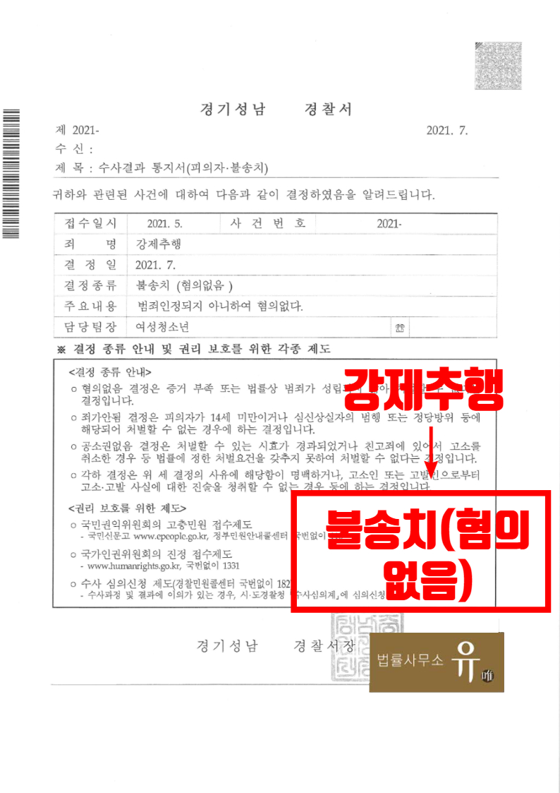관할 경찰서는 법률사무소 유 형사전문변호사의 변호인의견 등을 적극적으로 받아들여 피의자(의뢰인)에 대하여 강제추행 혐의가 인정되지 않는다는 이유로 경찰단계에서 불송치결정으로 사건을 종결하였습니다.