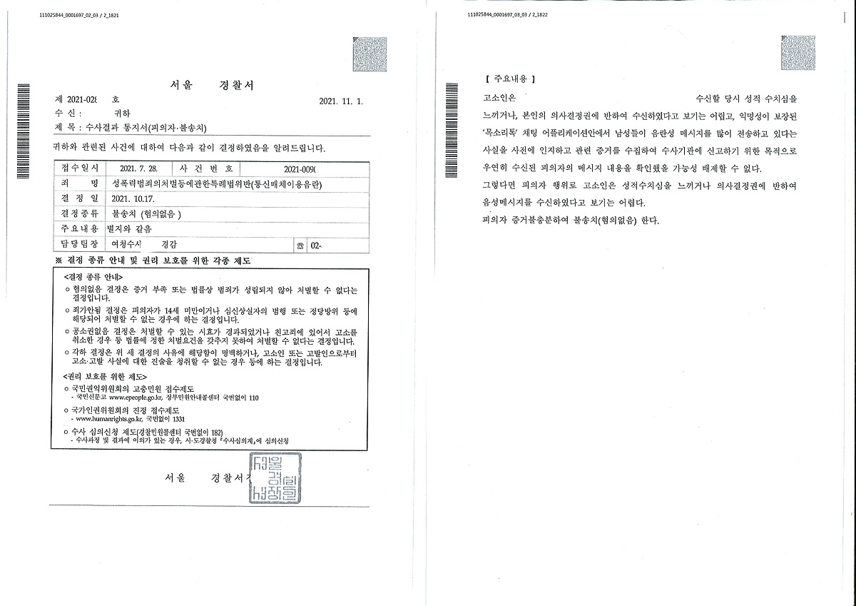 제가 담당하고 있는 성폭력범죄의처벌등에관한특례법 통신매체이용음란죄에 대하여 불송치가 계속 나오고 있어 이를 소개하고자 합니다. 통신매체이용음란죄와 관련하여 많은 상담이 들어오고 있습니다. 수위가 이렇게 높은데 무혐의가 가능하냐는 식의 문의가 많으나 대량고소와 메아리의 경우 내용에 무관하게 불송치가 가능하다는 언급을 이전 포스팅에서 한 바 있습니다. 또한 다톡이나 게임(롤, 마피아 등), 국민어장과 관련하여서도 고소장 내용을 보고 제가 무혐의를 받아줄 수 있을 것으로 판단되는 사건만 수임하고 있습니다. 그럼에도 다른 변호사와 의견이 다르다는 이유 및 단지 착수금 따먹기식의 제안을 한 것은 아닌지 의심의 눈초리를 보내는 사람은 여전히 많습니다. 성폭력범죄의처벌등에관한특례법 통신매체이용음란죄과 관련하여 매우 수위가 높은 사안에 대하여 실제 불송치결정이 내려졌고 불송치이유 역시 제가 주장하는 것이 그대로 받아들여졌습니다.