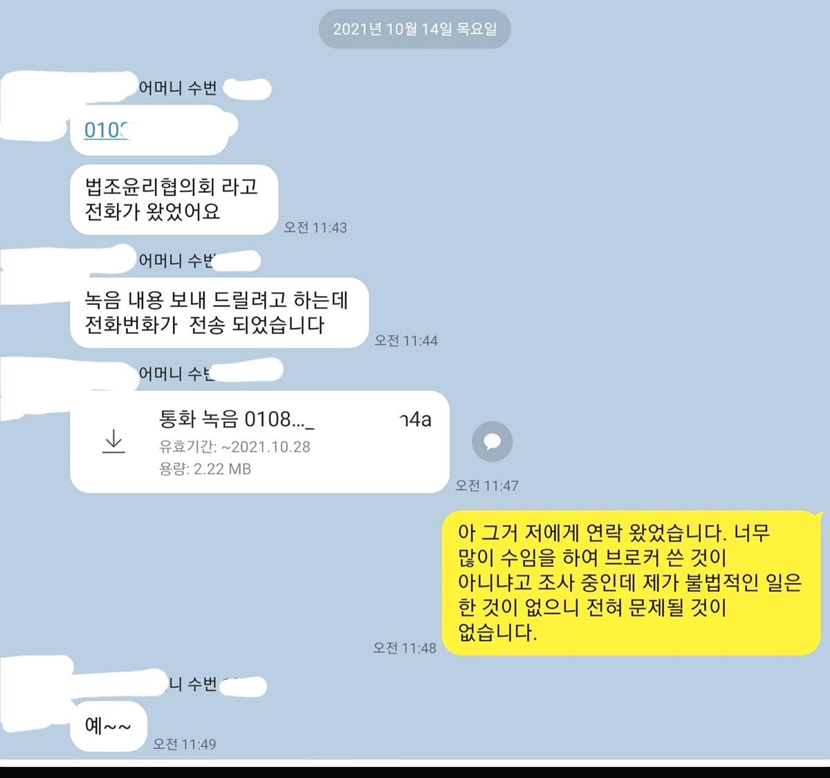 저는 하나의 사건마다 한 사람의 인생이 달려있는 것을 잘 알고 있기 때문에 최선을 다해 열심히 변호하였고, 예상을 뛰어넘는 좋은 결과가 많아 사건을 많이 수임하게 된 것입니다. 브로커를 쓴 것도 아니고 탈세를 한 것도 아님에도 사건을 많이 수임하였다고 이전에 YK가 받았던 조사를 받게 되었습니다. 누구보다 윤리적으로 변호사 생활하고 있다고 자부하고 있는데 법조윤리협의회로부터 조사를 받고 있습니다. 저 역시 변호사협회에 월회비를 내고 있는데, 열심히 하는 변호사를 도와줄 생각을 해야지 조사를 한다는데 기분이 좋을 리는 없으나 어차피 법적으로 걸릴 것은 전혀 없어서 걱정될 것은 없습니다. 다만 제 의뢰인들에게 연락을 해서 확인하는 과정에서 의뢰인들에게 혹시 이 변호사가 무슨 문제가 있는 사람은 아닌가 제 체면이 깎이는 점은 어쩔 수 없는 것 같습니다.
