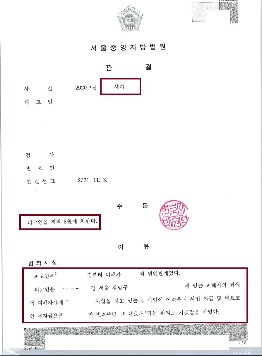 특히 사기죄가 인정되었기 때문에 상대방의 개인회생 절차 진행을 막을 수 있는 길이 열리게 되었고 민사소송도 보다 더 수월하게 진행될 수 있을 것으로 기대하고 있습니다.