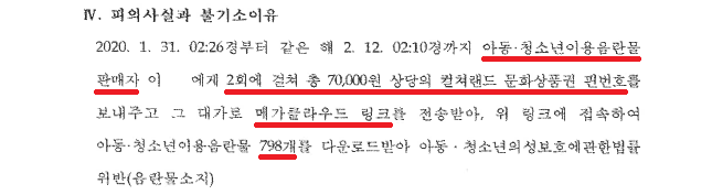 대학생 A씨는 2020. 1. 31.경과 2020. 2. 12.경에 아청물 판매자 이○○에게 총 2회에 걸쳐 합계 70,000원 상당의 문화상품권 PIN 번호를 전송하고 아청물 798개가 저장되어 있는 메가클라우드 링크를 전송받았습니다.