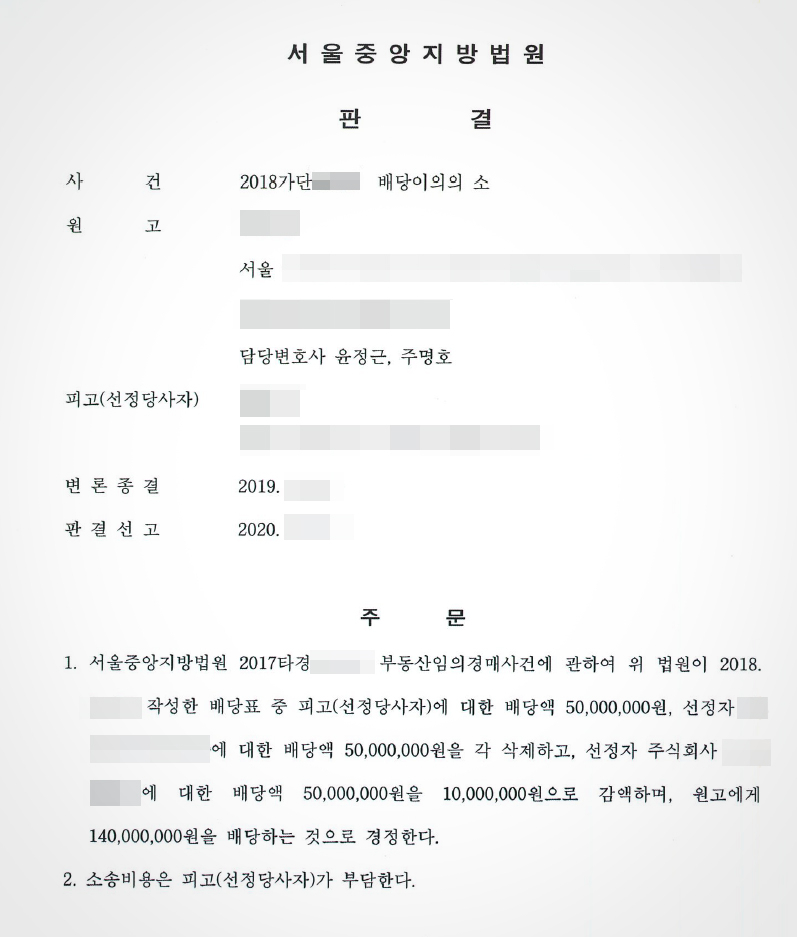 의뢰인의 배당이의가 전부 인정되어 아래와 같이 배당표가 경정되었습니다.