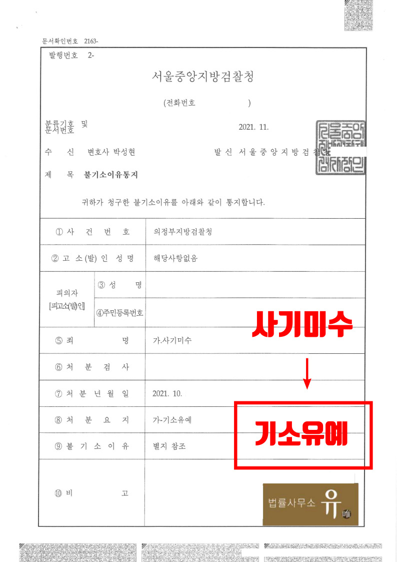 의정부지방검찰청은 법률사무소 유(唯)의 형사전문변호사가 작성하여 제출한 변호인의견서와 양형자료를 참작하여 의뢰인에게 기소유예처분을 하였습니다.