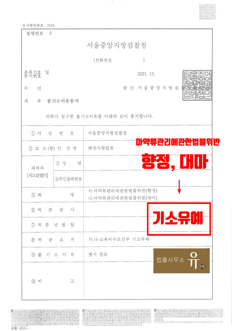 서울중앙지방검찰청은 의뢰인의 범죄사실을 인정하면서도, 의뢰인의 범행 동기와 치료 및 재활의지 등을 상세하게 부각하여 정리한 법률사무소 유(唯) 마약전문변호사의 변호인의견을 수용하여 기소유예 처분을 하였습니다.