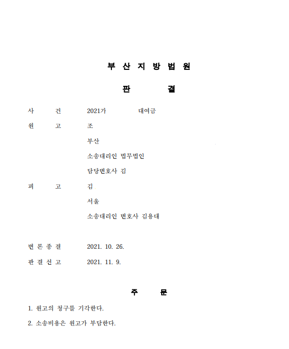이에 대해 A씨는 본 법률사무소를 선임하여 위 송금이 대여가 아니라 증여라고 주장을 하였고, 결국 부산지방법원은 2021년 11월경 "원고인 B가 '내가 아무리 생각해도 돈을 잘못 보낸 것 같다. 이틀만에 다시 좀 줘라라고 이 말하려고 만난 거였는데...'라는 등의 대화 내용에 비추어보면 원고가 처음에는 증여의 의사로 돈을 교부한 것으로 보인다."라며 원고 청구 기각 피고 승소판결을 선고하였습니다.