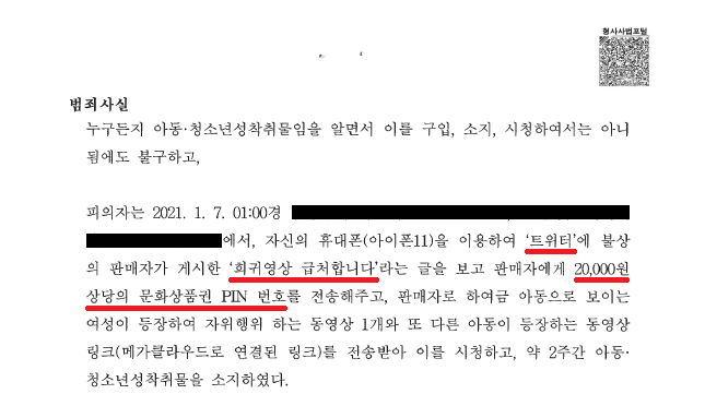 대학생 A씨는 방학을 맞이하여 새벽까지 휴대폰을 하면서 쉬던 중, 트위터에서 B씨가 게시한 '희귀영상 급처합니다'라는 글을 발견하였습니다. A씨는 B씨에게 트위터 DM(Direct Messaage)으로 구매의사를 밝혔더니, B씨는 성착취물이 포함된 샘플 영상 몇 개를 보내주었습니다. A씨는 순간적으로 호기심이 생겨 B씨가 알려주는 바와 같이 20,000원 상당의 문화상품권 PIN 번호를 전송하고, B씨로부터 성착취물이 포함된 음란물이 저장되어 있는 메가클라우드 링크를 전송받았습니다. A씨는 성착취물을 포함한 모든 음란물을 휴대폰으로 다운로드받아 약 2주간 소지하며 시청한 뒤 휴대폰을 정리하면서 모두 삭제하였습니다.
