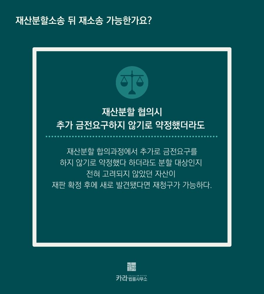 즉, 재산분할 합의과정에서 추가로 금전요구를 하지 않기로 약정했다 하더라도 분할 대상인지 전혀 고려되지 않았던 자산이 재판 확정 후에 새로 발견됐다면 재청구가 가능하다는 뜻입니다.