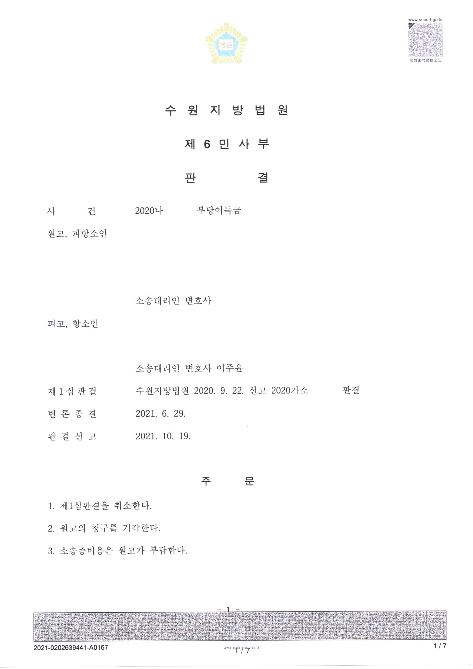 (이주윤 변호사 피고 대리 승소!)