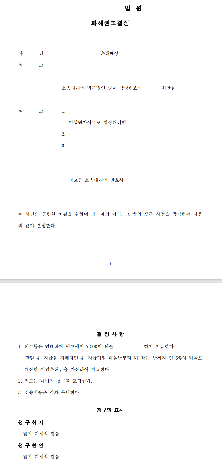 법원은 화해권고결정과 함께 판결이 선고될 경우 참작될 금액을 제시했습니다. 그 금액은 7,000만 원 이상이었으나 피고들의 부담과 금전 지급의 용이성을 위하여 저희 측도 이의신청을 하지 않기로 하였으며, 이에 화해권고결정은 확정되었습니다.