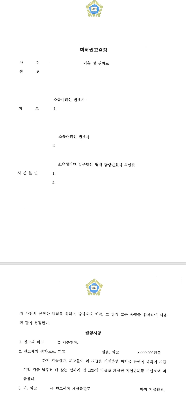 2차례의 조정과정을 거쳤으며, 이를 바탕으로 재판부의 화해권고 결정이 있었습니다. 피고2가 부정행위 상대방임은 인정되었으나 통상의 경우보다 현저히 낮은 위자료를 지급하라는 결정이 내려졌으며, 이의신청 기간을 거쳐 이는 확정되었습니다.
