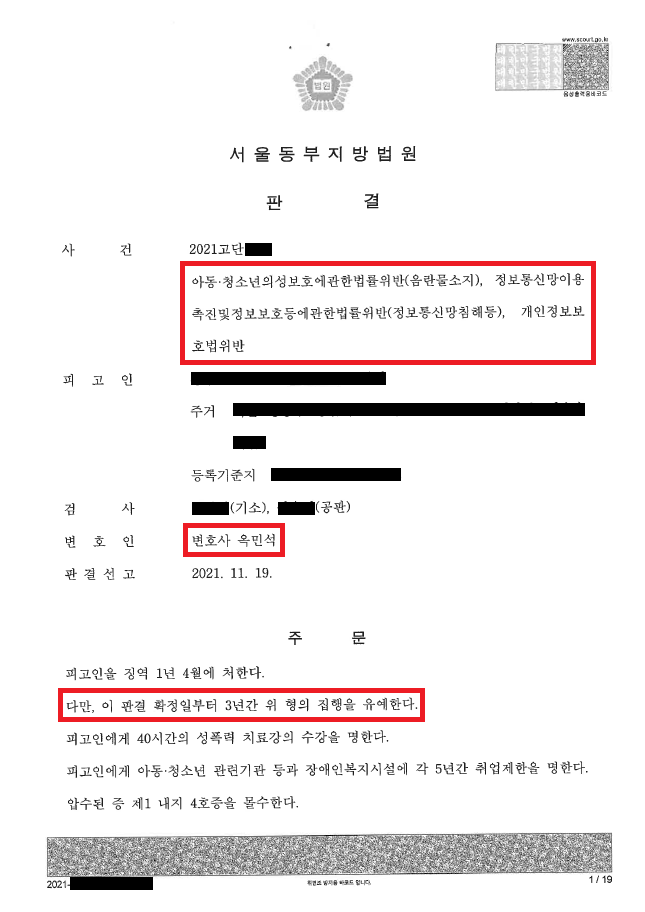 이러한 저의 조력을 바탕으로 A씨는 집행유예 기간 중에 불특정 다수의 네이버 아이디를 해킹 의뢰 및 구매한 뒤 박사방 유료회원으로 활동하여 실형이 선고될 가능성이 매우 높았음에도 불구하고 집행유예를 선고받았을 뿐만 아니라 신상정보공개 및 고지명령도 면제받음으로써 원하는 결과로 사건을 마무리할 수 있었습니다.