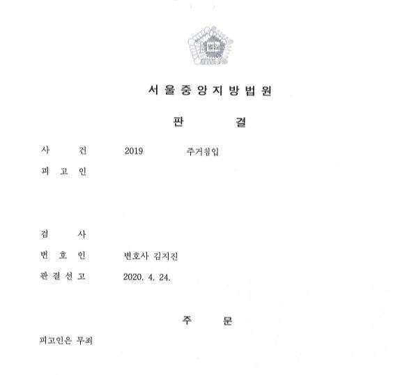 11일 법조계에 따르면, 서울중앙지법 형사13단독(판사 박영수)은 지난달 24일 주거침입죄로 기소된 A씨에 대한 재판에서 무죄판결을 내렸다.